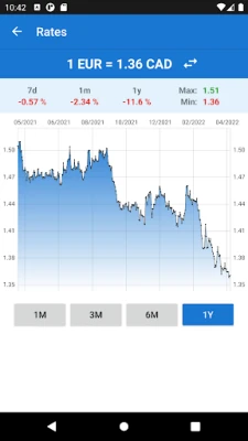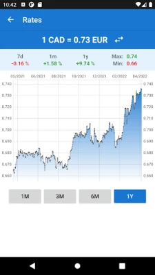 This application also allow you to see the chart with the historical exchange rates between Euro and Canadian Dollar . Rates variations from the last week and months will be displayed and the highest and lowest rates. You can also custom the chart in order to see the historical for the last month, trimester, semester or year.