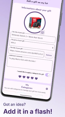 Completing your gift list is tedious? Family Gift offers you to copy and paste directly the links of the biggest e-commerce websites and the app takes care of the rest! You can also share an url from your browser to automatically add your idea to your gift list, or one of your loved ones!