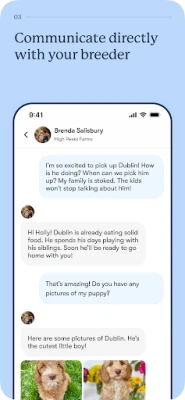 Through our messenger, you can easily message your breeder and build a partnership. Share your preferences, ask questions, and get regular updates, including photos and videos of your puppy as they grow.