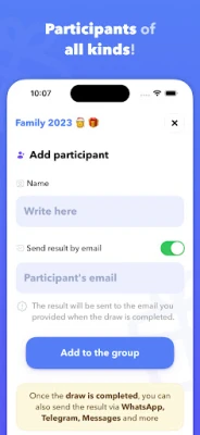 Invite all your friends and family to join. You can add the participants using their email or sharing the group code on WhatsApp, Facebook, Messenger, Instagram, email or SMS.