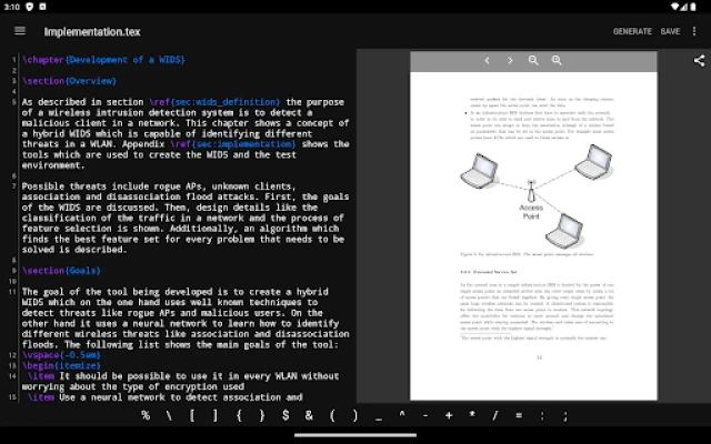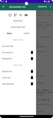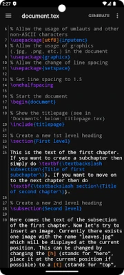 VerbTeX is a collaborative LaTeX Editor for your Android device. It allows you to create and manage LaTeX projects directly on your Android device and generate a PDF offline (Verbnox) or online (Verbosus).