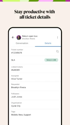 Add the right people to the conversation with @mentions, create new tickets and update assignees and CCs, plus add followers, tags, and any other field while on the move.